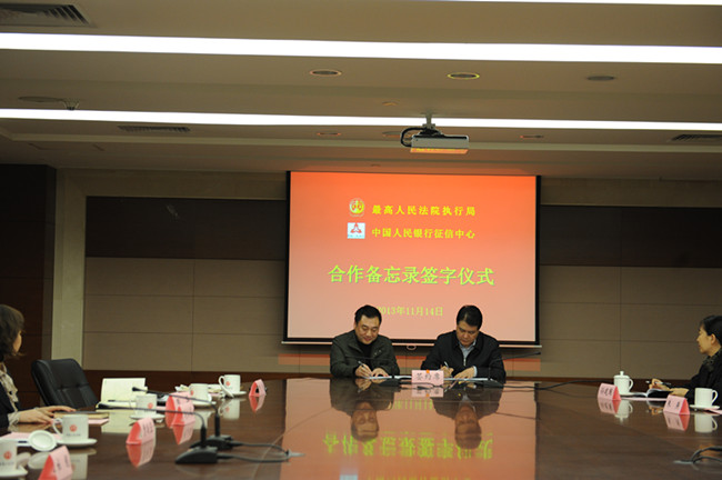 2013年11月14日,征信中心與最高人民法院執(zhí)行局就失信被執(zhí)行人名單信息納入征信系統(tǒng)簽署合作備忘錄,征信中心曹凝蓉主任與執(zhí)行局劉貴祥局長出席簽署儀式并代表各自單位簽署合作備忘錄。簽署儀式上,劉貴祥局長介紹了最高人民法院失信被執(zhí)行人名單信息公布與查詢平臺上線以來取得的顯著社會效果,曹凝蓉主任介紹了征信系統(tǒng)的建設(shè)背景和運行現(xiàn)狀,雙方均表示失信被執(zhí)行人名單信息納入征信系統(tǒng)將既有利于防范信貸風(fēng)險,維護(hù)金融安全,又有助于推動社會信用體系建設(shè),提升我國司法執(zhí)行效率。下一步,雙方將依據(jù)合作備忘錄抓緊開展合作事宜,并視條件深合作,拓展合作領(lǐng)域,實現(xiàn)司法公開和征信系統(tǒng)建設(shè)的雙贏。